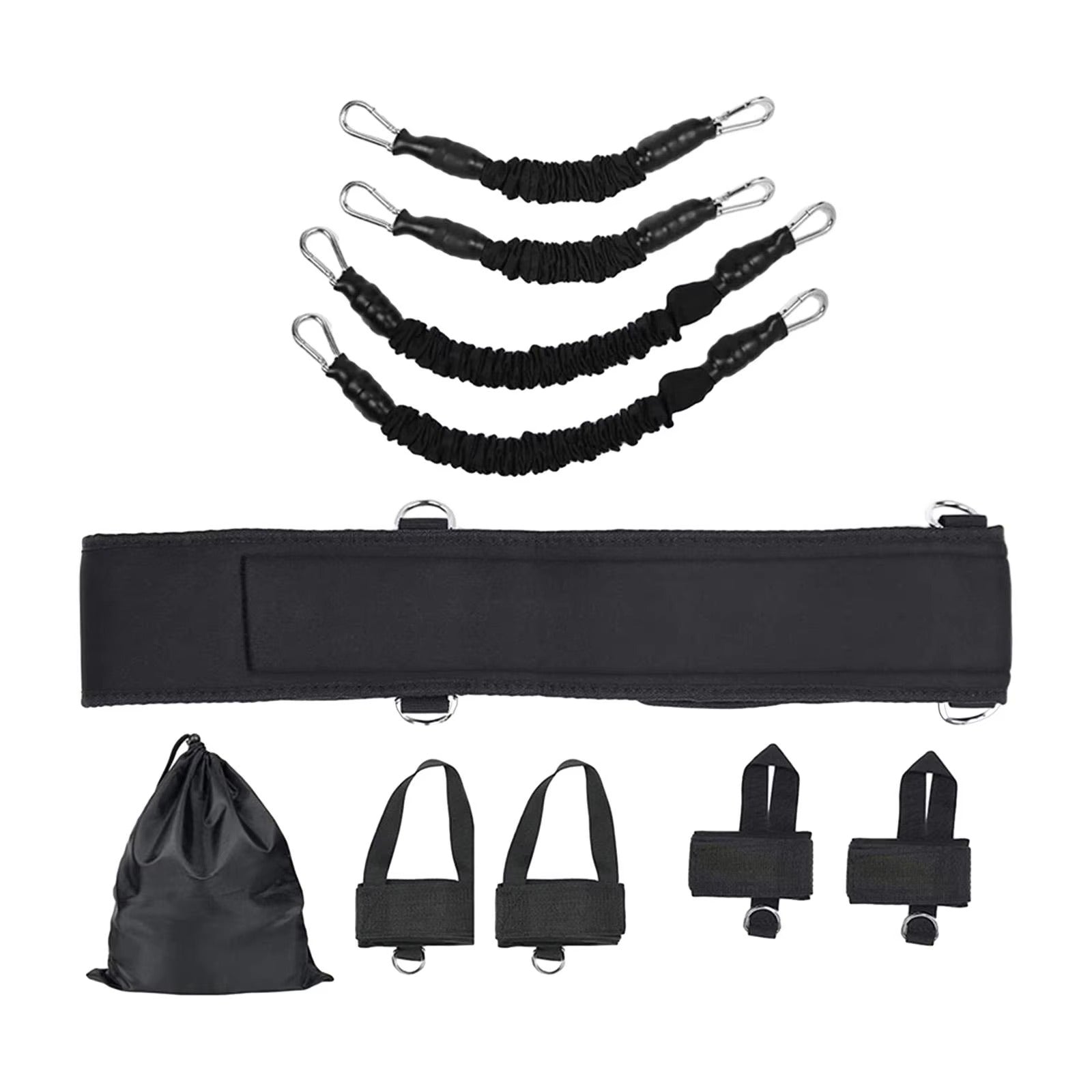 Convenient and Durable: The set includes durable ankle straps, wrist straps, and a waist belt, ensuring long-lasting use. A strong carabiner enhances the resistance level, and a fabric connector secures the equipment to prevent any accidents during workouts.