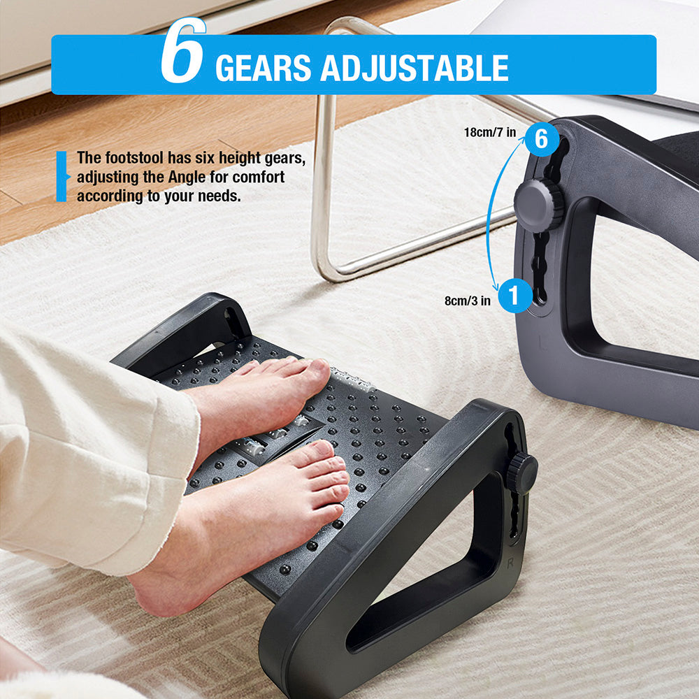 • 6-Level Height Adjustability: With 6 adjustable height positions (from 3.5" to 7.4"), this foot stool easily adapts to your comfort needs, allowing optimal foot support for various users and aiding shorter individuals in avoiding dangling feet.
