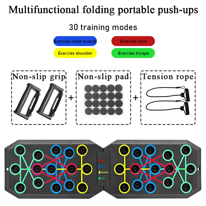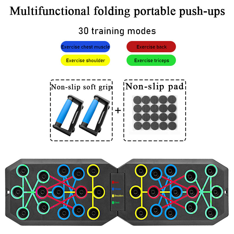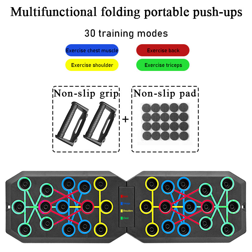 • Portable Push-Up Board: Color-coded handles to target specific muscle groups, optimizing workouts and preventing plateau.