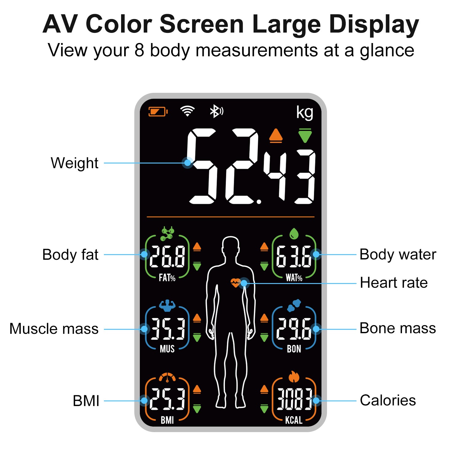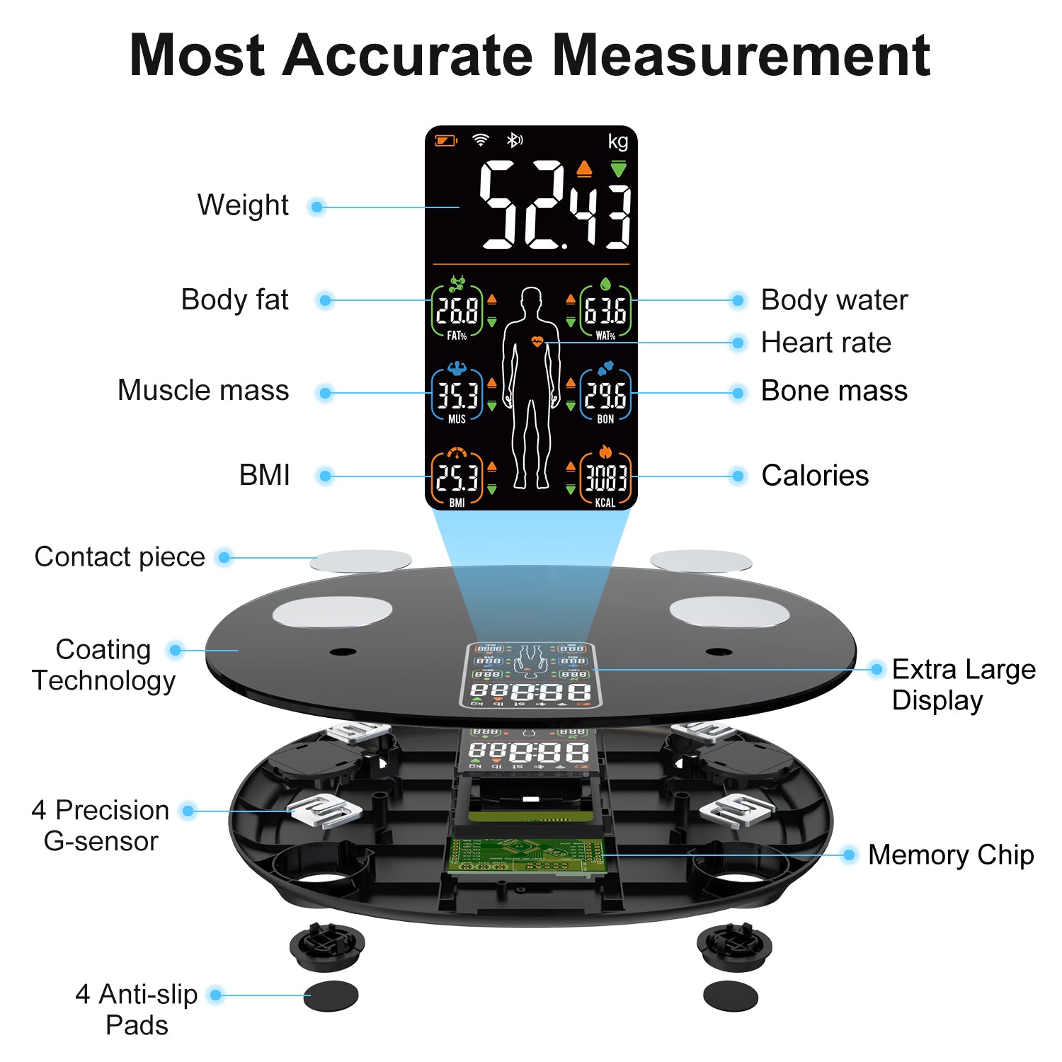 - Data Tracking: Monitors 8 key metrics: Weight, Body Fat, BMI, Body Water, Muscle Mass, Heart Rate, Calories, and Bone Mass.